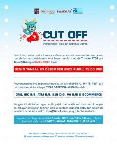 Untuk mencegah transaksi pajak dan retribusi masuk kas daerah melewati tahun berjalan, maka dengan ini kami informasikan penyesuaian batas akhir waktu (cut off time) pelayanan penerimaan pembayaran pajak daerah dan retribusi daerah Kota Bogor melalui metode Transfer RTGS dan Teller BJB pada hari Senin tanggal 29 Desember 2025 pukul 15:00 WIB.